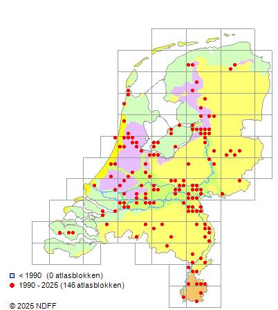 Het aantal atlasblokken (5x5 km) waarin de soort is gemeld binnen een periode van vijf jaar (vanaf 1980) of twintig jaar. Niet gecorrigeerd voor waarnemersinspanning en het aantal doorgegeven waarnemingen kan sterk variëren per periode, dus een trend in verspreiding kan hier niet direct uit worden afgelezen. Het opgegeven jaartal is het eerste jaar van de periode. Bron: gevalideerde waarnemingen uit de NDFF.