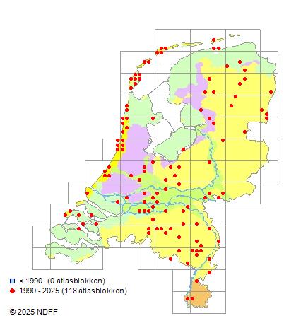 Het aantal atlasblokken (5x5 km) waarin de soort is gemeld binnen een periode van vijf jaar (vanaf 1980) of twintig jaar. Niet gecorrigeerd voor waarnemersinspanning en het aantal doorgegeven waarnemingen kan sterk variëren per periode, dus een trend in verspreiding kan hier niet direct uit worden afgelezen. Het opgegeven jaartal is het eerste jaar van de periode. Bron: gevalideerde waarnemingen uit de NDFF.
