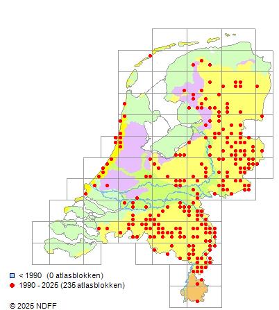 Het aantal atlasblokken (5x5 km) waarin de soort is gemeld binnen een periode van vijf jaar (vanaf 1980) of twintig jaar. Niet gecorrigeerd voor waarnemersinspanning en het aantal doorgegeven waarnemingen kan sterk variëren per periode, dus een trend in verspreiding kan hier niet direct uit worden afgelezen. Het opgegeven jaartal is het eerste jaar van de periode. Bron: gevalideerde waarnemingen uit de NDFF.