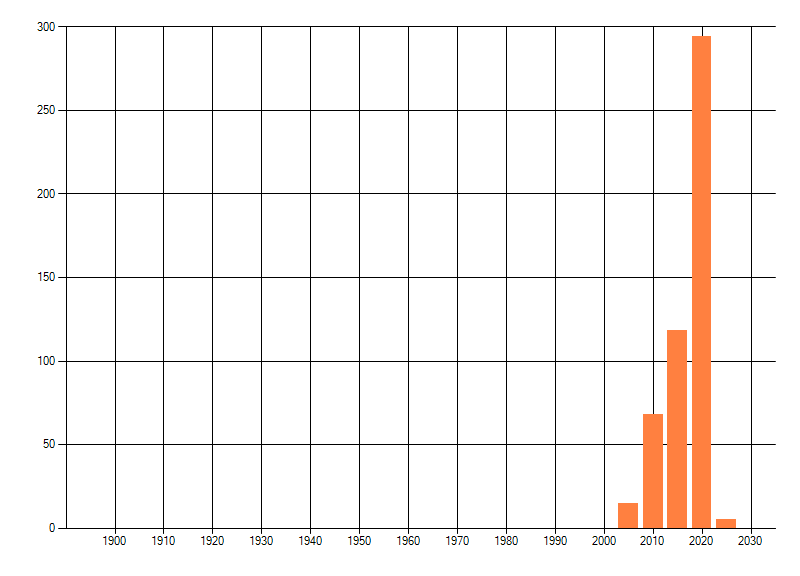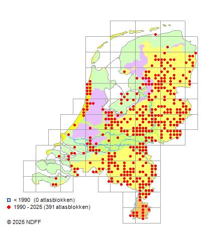 Het aantal atlasblokken (5x5 km) waarin de soort is gemeld binnen een periode van vijf jaar (vanaf 1980) of twintig jaar. Niet gecorrigeerd voor waarnemersinspanning en het aantal doorgegeven waarnemingen kan sterk variëren per periode, dus een trend in verspreiding kan hier niet direct uit worden afgelezen. Het opgegeven jaartal is het eerste jaar van de periode. Bron: gevalideerde waarnemingen uit de NDFF.