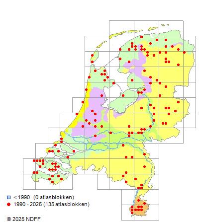 Het aantal atlasblokken (5x5 km) waarin de soort is gemeld binnen een periode van vijf jaar (vanaf 1980) of twintig jaar. Niet gecorrigeerd voor waarnemersinspanning en het aantal doorgegeven waarnemingen kan sterk variëren per periode, dus een trend in verspreiding kan hier niet direct uit worden afgelezen. Het opgegeven jaartal is het eerste jaar van de periode. Bron: gevalideerde waarnemingen uit de NDFF.