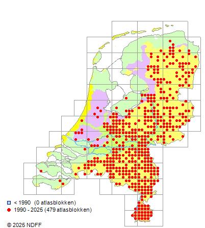 Het aantal atlasblokken (5x5 km) waarin de soort is gemeld binnen een periode van vijf jaar (vanaf 1980) of twintig jaar. Niet gecorrigeerd voor waarnemersinspanning en het aantal doorgegeven waarnemingen kan sterk variëren per periode, dus een trend in verspreiding kan hier niet direct uit worden afgelezen. Het opgegeven jaartal is het eerste jaar van de periode. Bron: gevalideerde waarnemingen uit de NDFF.