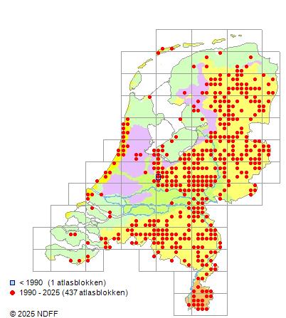 Het aantal atlasblokken (5x5 km) waarin de soort is gemeld binnen een periode van vijf jaar (vanaf 1980) of twintig jaar. Niet gecorrigeerd voor waarnemersinspanning en het aantal doorgegeven waarnemingen kan sterk variëren per periode, dus een trend in verspreiding kan hier niet direct uit worden afgelezen. Het opgegeven jaartal is het eerste jaar van de periode. Bron: gevalideerde waarnemingen uit de NDFF.