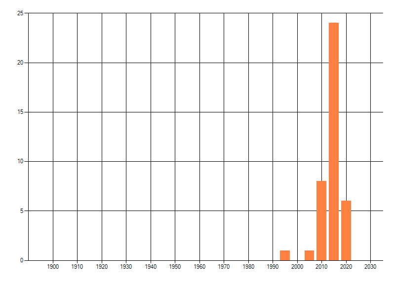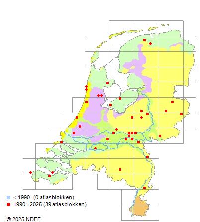 Het aantal atlasblokken (5x5 km) waarin de soort is gemeld binnen een periode van vijf jaar (vanaf 1980) of twintig jaar. Niet gecorrigeerd voor waarnemersinspanning en het aantal doorgegeven waarnemingen kan sterk variëren per periode, dus een trend in verspreiding kan hier niet direct uit worden afgelezen. Het opgegeven jaartal is het eerste jaar van de periode. Bron: gevalideerde waarnemingen uit de NDFF.