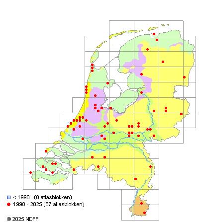 Het aantal atlasblokken (5x5 km) waarin de soort is gemeld binnen een periode van vijf jaar (vanaf 1980) of twintig jaar. Niet gecorrigeerd voor waarnemersinspanning en het aantal doorgegeven waarnemingen kan sterk variëren per periode, dus een trend in verspreiding kan hier niet direct uit worden afgelezen. Het opgegeven jaartal is het eerste jaar van de periode. Bron: gevalideerde waarnemingen uit de NDFF.