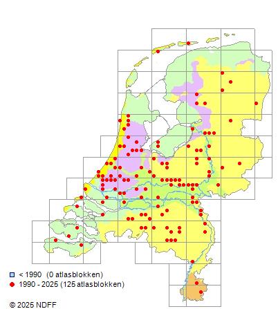 Het aantal atlasblokken (5x5 km) waarin de soort is gemeld binnen een periode van vijf jaar (vanaf 1980) of twintig jaar. Niet gecorrigeerd voor waarnemersinspanning en het aantal doorgegeven waarnemingen kan sterk variëren per periode, dus een trend in verspreiding kan hier niet direct uit worden afgelezen. Het opgegeven jaartal is het eerste jaar van de periode. Bron: gevalideerde waarnemingen uit de NDFF.