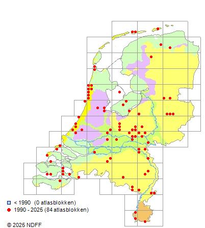 Het aantal atlasblokken (5x5 km) waarin de soort is gemeld binnen een periode van vijf jaar (vanaf 1980) of twintig jaar. Niet gecorrigeerd voor waarnemersinspanning en het aantal doorgegeven waarnemingen kan sterk variëren per periode, dus een trend in verspreiding kan hier niet direct uit worden afgelezen. Het opgegeven jaartal is het eerste jaar van de periode. Bron: gevalideerde waarnemingen uit de NDFF.