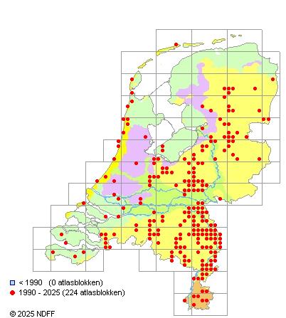 Het aantal atlasblokken (5x5 km) waarin de soort is gemeld binnen een periode van vijf jaar (vanaf 1980) of twintig jaar. Niet gecorrigeerd voor waarnemersinspanning en het aantal doorgegeven waarnemingen kan sterk variëren per periode, dus een trend in verspreiding kan hier niet direct uit worden afgelezen. Het opgegeven jaartal is het eerste jaar van de periode. Bron: gevalideerde waarnemingen uit de NDFF.