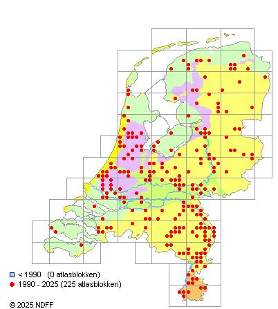 Het aantal atlasblokken (5x5 km) waarin de soort is gemeld binnen een periode van vijf jaar (vanaf 1980) of twintig jaar. Niet gecorrigeerd voor waarnemersinspanning en het aantal doorgegeven waarnemingen kan sterk variëren per periode, dus een trend in verspreiding kan hier niet direct uit worden afgelezen. Het opgegeven jaartal is het eerste jaar van de periode. Bron: gevalideerde waarnemingen uit de NDFF.