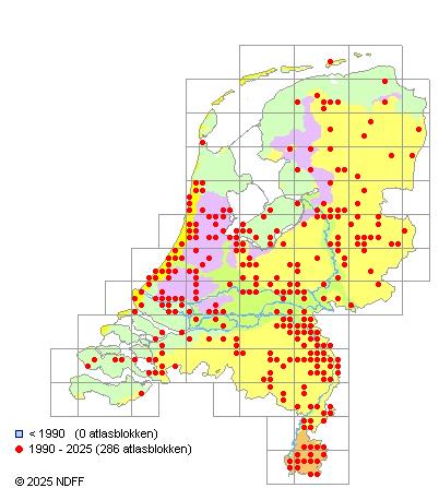 Het aantal atlasblokken (5x5 km) waarin de soort is gemeld binnen een periode van vijf jaar (vanaf 1980) of twintig jaar. Niet gecorrigeerd voor waarnemersinspanning en het aantal doorgegeven waarnemingen kan sterk variëren per periode, dus een trend in verspreiding kan hier niet direct uit worden afgelezen. Het opgegeven jaartal is het eerste jaar van de periode. Bron: gevalideerde waarnemingen uit de NDFF.