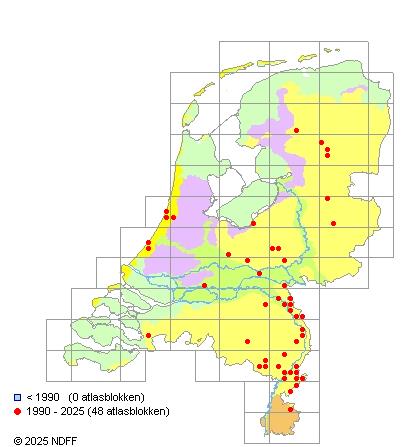 Het aantal atlasblokken (5x5 km) waarin de soort is gemeld binnen een periode van vijf jaar (vanaf 1980) of twintig jaar. Niet gecorrigeerd voor waarnemersinspanning en het aantal doorgegeven waarnemingen kan sterk variëren per periode, dus een trend in verspreiding kan hier niet direct uit worden afgelezen. Het opgegeven jaartal is het eerste jaar van de periode. Bron: gevalideerde waarnemingen uit de NDFF.