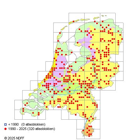 Het aantal atlasblokken (5x5 km) waarin de soort is gemeld binnen een periode van vijf jaar (vanaf 1980) of twintig jaar. Niet gecorrigeerd voor waarnemersinspanning en het aantal doorgegeven waarnemingen kan sterk variëren per periode, dus een trend in verspreiding kan hier niet direct uit worden afgelezen. Het opgegeven jaartal is het eerste jaar van de periode. Bron: gevalideerde waarnemingen uit de NDFF.