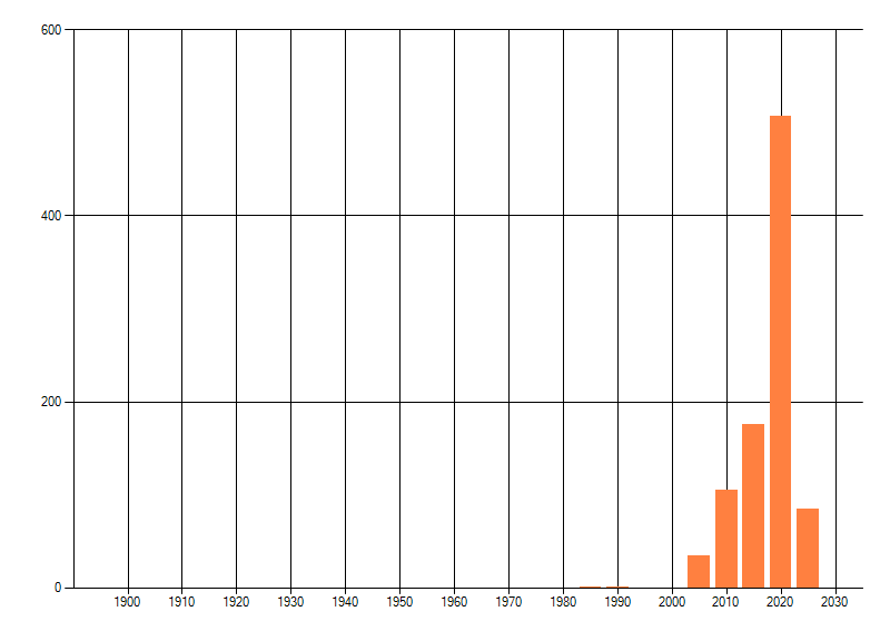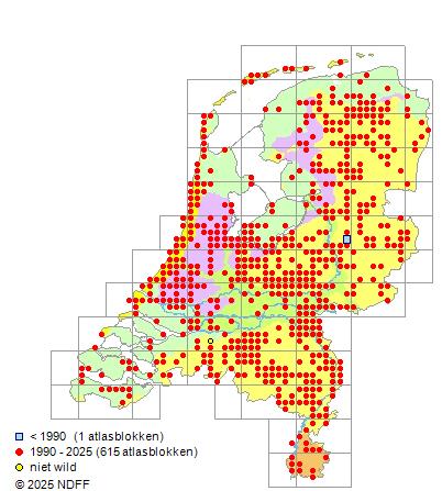 Het aantal atlasblokken (5x5 km) waarin de soort is gemeld binnen een periode van vijf jaar (vanaf 1980) of twintig jaar. Niet gecorrigeerd voor waarnemersinspanning en het aantal doorgegeven waarnemingen kan sterk variëren per periode, dus een trend in verspreiding kan hier niet direct uit worden afgelezen. Het opgegeven jaartal is het eerste jaar van de periode. Bron: gevalideerde waarnemingen uit de NDFF.
