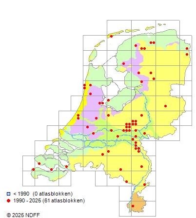 Het aantal atlasblokken (5x5 km) waarin de soort is gemeld binnen een periode van vijf jaar (vanaf 1980) of twintig jaar. Niet gecorrigeerd voor waarnemersinspanning en het aantal doorgegeven waarnemingen kan sterk variëren per periode, dus een trend in verspreiding kan hier niet direct uit worden afgelezen. Het opgegeven jaartal is het eerste jaar van de periode. Bron: gevalideerde waarnemingen uit de NDFF.