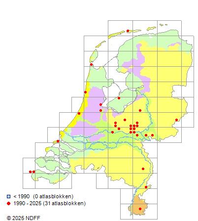 Het aantal atlasblokken (5x5 km) waarin de soort is gemeld binnen een periode van vijf jaar (vanaf 1980) of twintig jaar. Niet gecorrigeerd voor waarnemersinspanning en het aantal doorgegeven waarnemingen kan sterk variëren per periode, dus een trend in verspreiding kan hier niet direct uit worden afgelezen. Het opgegeven jaartal is het eerste jaar van de periode. Bron: gevalideerde waarnemingen uit de NDFF.