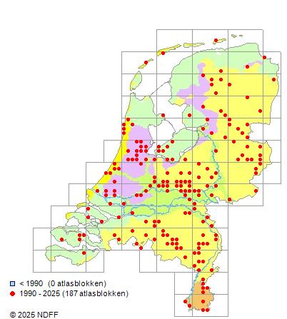 Het aantal atlasblokken (5x5 km) waarin de soort is gemeld binnen een periode van vijf jaar (vanaf 1980) of twintig jaar. Niet gecorrigeerd voor waarnemersinspanning en het aantal doorgegeven waarnemingen kan sterk variëren per periode, dus een trend in verspreiding kan hier niet direct uit worden afgelezen. Het opgegeven jaartal is het eerste jaar van de periode. Bron: gevalideerde waarnemingen uit de NDFF.