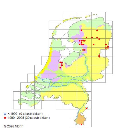 Het aantal atlasblokken (5x5 km) waarin de soort is gemeld binnen een periode van vijf jaar (vanaf 1980) of twintig jaar. Niet gecorrigeerd voor waarnemersinspanning en het aantal doorgegeven waarnemingen kan sterk variëren per periode, dus een trend in verspreiding kan hier niet direct uit worden afgelezen. Het opgegeven jaartal is het eerste jaar van de periode. Bron: gevalideerde waarnemingen uit de NDFF.