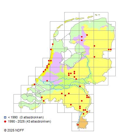 Het aantal atlasblokken (5x5 km) waarin de soort is gemeld binnen een periode van vijf jaar (vanaf 1980) of twintig jaar. Niet gecorrigeerd voor waarnemersinspanning en het aantal doorgegeven waarnemingen kan sterk variëren per periode, dus een trend in verspreiding kan hier niet direct uit worden afgelezen. Het opgegeven jaartal is het eerste jaar van de periode. Bron: gevalideerde waarnemingen uit de NDFF.