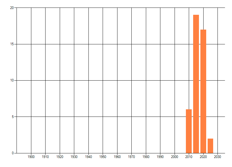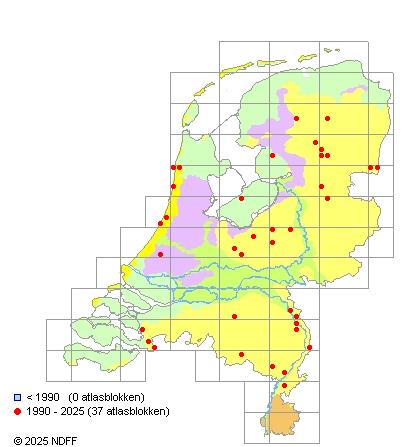 Het aantal atlasblokken (5x5 km) waarin de soort is gemeld binnen een periode van vijf jaar (vanaf 1980) of twintig jaar. Niet gecorrigeerd voor waarnemersinspanning en het aantal doorgegeven waarnemingen kan sterk variëren per periode, dus een trend in verspreiding kan hier niet direct uit worden afgelezen. Het opgegeven jaartal is het eerste jaar van de periode. Bron: gevalideerde waarnemingen uit de NDFF.