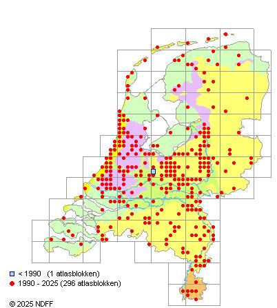 Het aantal atlasblokken (5x5 km) waarin de soort is gemeld binnen een periode van vijf jaar (vanaf 1980) of twintig jaar. Niet gecorrigeerd voor waarnemersinspanning en het aantal doorgegeven waarnemingen kan sterk variëren per periode, dus een trend in verspreiding kan hier niet direct uit worden afgelezen. Het opgegeven jaartal is het eerste jaar van de periode. Bron: gevalideerde waarnemingen uit de NDFF.
