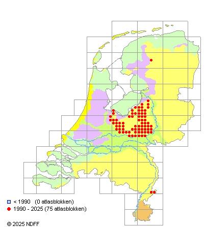 Het aantal atlasblokken (5x5 km) waarin de soort is gemeld binnen een periode van vijf jaar (vanaf 1980) of twintig jaar. Niet gecorrigeerd voor waarnemersinspanning en het aantal doorgegeven waarnemingen kan sterk variëren per periode, dus een trend in verspreiding kan hier niet direct uit worden afgelezen. Het opgegeven jaartal is het eerste jaar van de periode. Bron: gevalideerde waarnemingen uit de NDFF.
