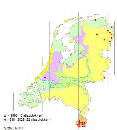 Het aantal atlasblokken (5x5 km) waarin de soort is gemeld binnen een periode van vijf jaar (vanaf 1980) of twintig jaar. Niet gecorrigeerd voor waarnemersinspanning en het aantal doorgegeven waarnemingen kan sterk variëren per periode, dus een trend in verspreiding kan hier niet direct uit worden afgelezen. Het opgegeven jaartal is het eerste jaar van de periode. Bron: gevalideerde waarnemingen uit de NDFF.