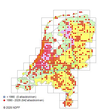 Het aantal atlasblokken (5x5 km) waarin de soort is gemeld binnen een periode van vijf jaar (vanaf 1980) of twintig jaar. Niet gecorrigeerd voor waarnemersinspanning en het aantal doorgegeven waarnemingen kan sterk variëren per periode, dus een trend in verspreiding kan hier niet direct uit worden afgelezen. Het opgegeven jaartal is het eerste jaar van de periode. Bron: gevalideerde waarnemingen uit de NDFF.