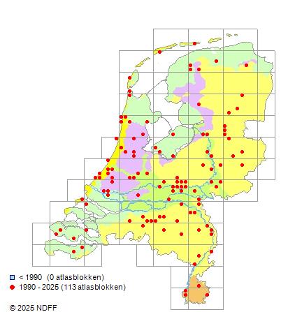 Het aantal atlasblokken (5x5 km) waarin de soort is gemeld binnen een periode van vijf jaar (vanaf 1980) of twintig jaar. Niet gecorrigeerd voor waarnemersinspanning en het aantal doorgegeven waarnemingen kan sterk variëren per periode, dus een trend in verspreiding kan hier niet direct uit worden afgelezen. Het opgegeven jaartal is het eerste jaar van de periode. Bron: gevalideerde waarnemingen uit de NDFF.