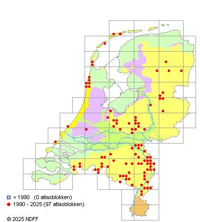Het aantal atlasblokken (5x5 km) waarin de soort is gemeld binnen een periode van vijf jaar (vanaf 1980) of twintig jaar. Niet gecorrigeerd voor waarnemersinspanning en het aantal doorgegeven waarnemingen kan sterk variëren per periode, dus een trend in verspreiding kan hier niet direct uit worden afgelezen. Het opgegeven jaartal is het eerste jaar van de periode. Bron: gevalideerde waarnemingen uit de NDFF.