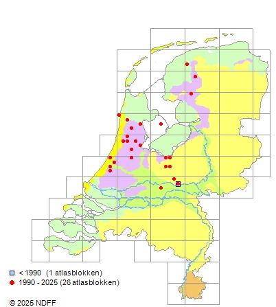 Het aantal atlasblokken (5x5 km) waarin de soort is gemeld binnen een periode van vijf jaar (vanaf 1980) of twintig jaar. Niet gecorrigeerd voor waarnemersinspanning en het aantal doorgegeven waarnemingen kan sterk variëren per periode, dus een trend in verspreiding kan hier niet direct uit worden afgelezen. Het opgegeven jaartal is het eerste jaar van de periode. Bron: gevalideerde waarnemingen uit de NDFF.