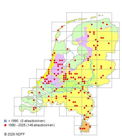 Het aantal atlasblokken (5x5 km) waarin de soort is gemeld binnen een periode van vijf jaar (vanaf 1980) of twintig jaar. Niet gecorrigeerd voor waarnemersinspanning en het aantal doorgegeven waarnemingen kan sterk variëren per periode, dus een trend in verspreiding kan hier niet direct uit worden afgelezen. Het opgegeven jaartal is het eerste jaar van de periode. Bron: gevalideerde waarnemingen uit de NDFF.