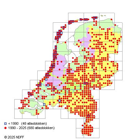 Het aantal atlasblokken (5x5 km) waarin de soort is gemeld binnen een periode van vijf jaar (vanaf 1980) of twintig jaar. Niet gecorrigeerd voor waarnemersinspanning en het aantal doorgegeven waarnemingen kan sterk variëren per periode, dus een trend in verspreiding kan hier niet direct uit worden afgelezen. Het opgegeven jaartal is het eerste jaar van de periode. Bron: gevalideerde waarnemingen uit de NDFF.