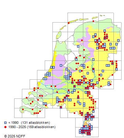Het aantal atlasblokken (5x5 km) waarin de soort is gemeld binnen een periode van vijf jaar (vanaf 1980) of twintig jaar. Niet gecorrigeerd voor waarnemersinspanning en het aantal doorgegeven waarnemingen kan sterk variëren per periode, dus een trend in verspreiding kan hier niet direct uit worden afgelezen. Het opgegeven jaartal is het eerste jaar van de periode. Bron: gevalideerde waarnemingen uit de NDFF.