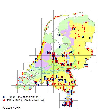 Het aantal atlasblokken (5x5 km) waarin de soort is gemeld binnen een periode van vijf jaar (vanaf 1980) of twintig jaar. Niet gecorrigeerd voor waarnemersinspanning en het aantal doorgegeven waarnemingen kan sterk variëren per periode, dus een trend in verspreiding kan hier niet direct uit worden afgelezen. Het opgegeven jaartal is het eerste jaar van de periode. Bron: gevalideerde waarnemingen uit de NDFF.