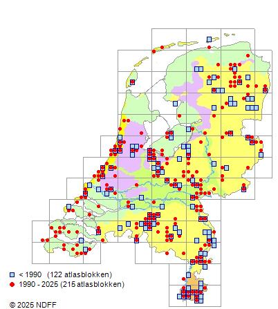 Het aantal atlasblokken (5x5 km) waarin de soort is gemeld binnen een periode van vijf jaar (vanaf 1980) of twintig jaar. Niet gecorrigeerd voor waarnemersinspanning en het aantal doorgegeven waarnemingen kan sterk variëren per periode, dus een trend in verspreiding kan hier niet direct uit worden afgelezen. Het opgegeven jaartal is het eerste jaar van de periode. Bron: gevalideerde waarnemingen uit de NDFF.