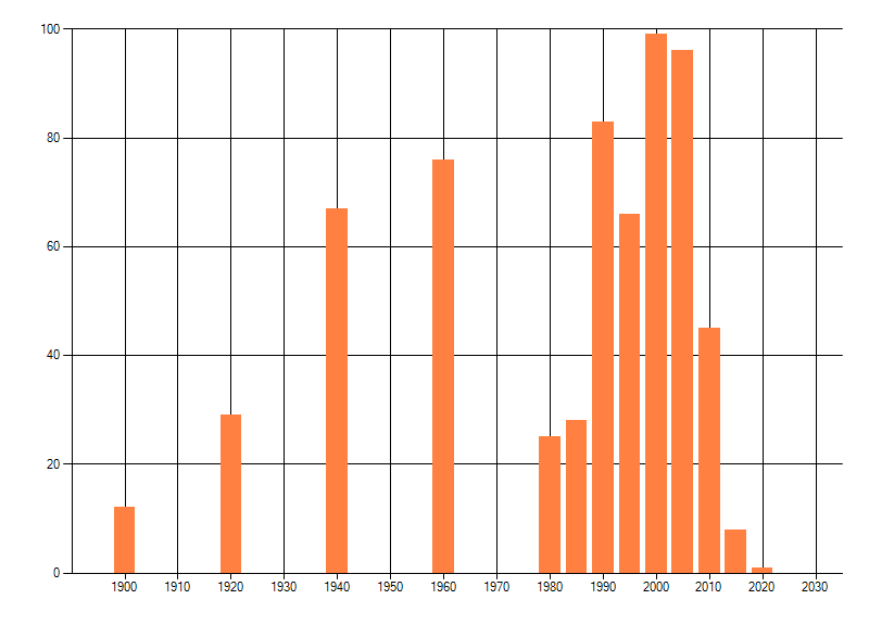 Het aantal atlasblokken (5x5 km) waarin de soort is gemeld binnen een periode van vijf jaar (vanaf 1980) of twintig jaar. Niet gecorrigeerd voor waarnemersinspanning en het aantal doorgegeven waarnemingen kan sterk variëren per periode, dus een trend in verspreiding kan hier niet direct uit worden afgelezen. Het opgegeven jaartal is het eerste jaar van de periode. Bron: gevalideerde waarnemingen uit de NDFF.