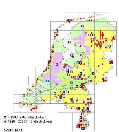 Het aantal atlasblokken (5x5 km) waarin de soort is gemeld binnen een periode van vijf jaar (vanaf 1980) of twintig jaar. Niet gecorrigeerd voor waarnemersinspanning en het aantal doorgegeven waarnemingen kan sterk variëren per periode, dus een trend in verspreiding kan hier niet direct uit worden afgelezen. Het opgegeven jaartal is het eerste jaar van de periode. Bron: gevalideerde waarnemingen uit de NDFF.