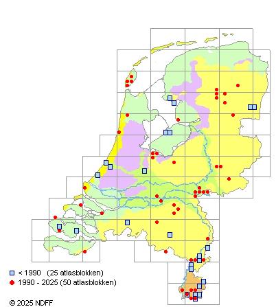 Het aantal atlasblokken (5x5 km) waarin de soort is gemeld binnen een periode van vijf jaar (vanaf 1980) of twintig jaar. Niet gecorrigeerd voor waarnemersinspanning en het aantal doorgegeven waarnemingen kan sterk variëren per periode, dus een trend in verspreiding kan hier niet direct uit worden afgelezen. Het opgegeven jaartal is het eerste jaar van de periode. Bron: gevalideerde waarnemingen uit de NDFF.