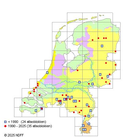 Het aantal atlasblokken (5x5 km) waarin de soort is gemeld binnen een periode van vijf jaar (vanaf 1980) of twintig jaar. Niet gecorrigeerd voor waarnemersinspanning en het aantal doorgegeven waarnemingen kan sterk variëren per periode, dus een trend in verspreiding kan hier niet direct uit worden afgelezen. Het opgegeven jaartal is het eerste jaar van de periode. Bron: gevalideerde waarnemingen uit de NDFF.