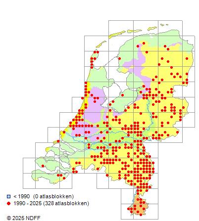 Het aantal atlasblokken (5x5 km) waarin de soort is gemeld binnen een periode van vijf jaar (vanaf 1980) of twintig jaar. Niet gecorrigeerd voor waarnemersinspanning en het aantal doorgegeven waarnemingen kan sterk variëren per periode, dus een trend in verspreiding kan hier niet direct uit worden afgelezen. Het opgegeven jaartal is het eerste jaar van de periode. Bron: gevalideerde waarnemingen uit de NDFF.