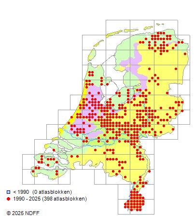 Het aantal atlasblokken (5x5 km) waarin de soort is gemeld binnen een periode van vijf jaar (vanaf 1980) of twintig jaar. Niet gecorrigeerd voor waarnemersinspanning en het aantal doorgegeven waarnemingen kan sterk variëren per periode, dus een trend in verspreiding kan hier niet direct uit worden afgelezen. Het opgegeven jaartal is het eerste jaar van de periode. Bron: gevalideerde waarnemingen uit de NDFF.