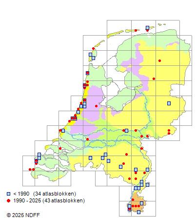 Het aantal atlasblokken (5x5 km) waarin de soort is gemeld binnen een periode van vijf jaar (vanaf 1980) of twintig jaar. Niet gecorrigeerd voor waarnemersinspanning en het aantal doorgegeven waarnemingen kan sterk variëren per periode, dus een trend in verspreiding kan hier niet direct uit worden afgelezen. Het opgegeven jaartal is het eerste jaar van de periode. Bron: gevalideerde waarnemingen uit de NDFF.