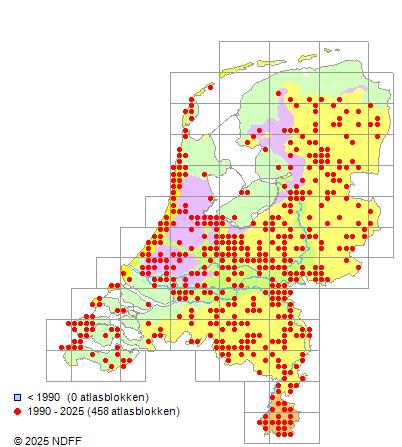 Het aantal atlasblokken (5x5 km) waarin de soort is gemeld binnen een periode van vijf jaar (vanaf 1980) of twintig jaar. Niet gecorrigeerd voor waarnemersinspanning en het aantal doorgegeven waarnemingen kan sterk variëren per periode, dus een trend in verspreiding kan hier niet direct uit worden afgelezen. Het opgegeven jaartal is het eerste jaar van de periode. Bron: gevalideerde waarnemingen uit de NDFF.