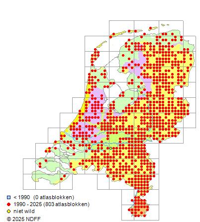 Het aantal atlasblokken (5x5 km) waarin de soort is gemeld binnen een periode van vijf jaar (vanaf 1980) of twintig jaar. Niet gecorrigeerd voor waarnemersinspanning en het aantal doorgegeven waarnemingen kan sterk variëren per periode, dus een trend in verspreiding kan hier niet direct uit worden afgelezen. Het opgegeven jaartal is het eerste jaar van de periode. Bron: gevalideerde waarnemingen uit de NDFF.