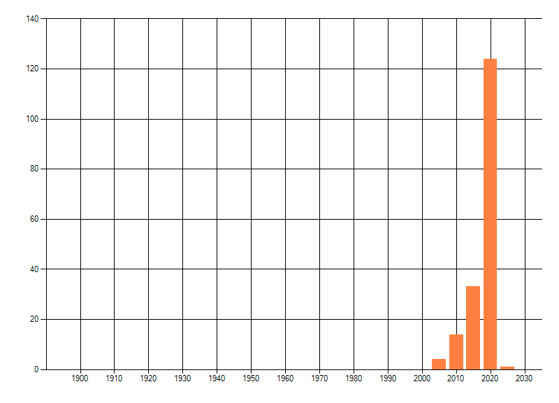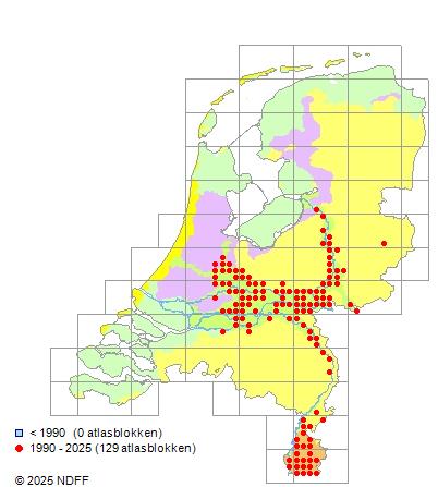 Het aantal atlasblokken (5x5 km) waarin de soort is gemeld binnen een periode van vijf jaar (vanaf 1980) of twintig jaar. Niet gecorrigeerd voor waarnemersinspanning en het aantal doorgegeven waarnemingen kan sterk variëren per periode, dus een trend in verspreiding kan hier niet direct uit worden afgelezen. Het opgegeven jaartal is het eerste jaar van de periode. Bron: gevalideerde waarnemingen uit de NDFF.