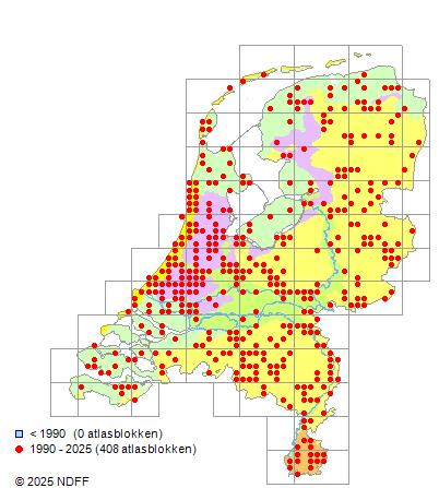Het aantal atlasblokken (5x5 km) waarin de soort is gemeld binnen een periode van vijf jaar (vanaf 1980) of twintig jaar. Niet gecorrigeerd voor waarnemersinspanning en het aantal doorgegeven waarnemingen kan sterk variëren per periode, dus een trend in verspreiding kan hier niet direct uit worden afgelezen. Het opgegeven jaartal is het eerste jaar van de periode. Bron: gevalideerde waarnemingen uit de NDFF.
