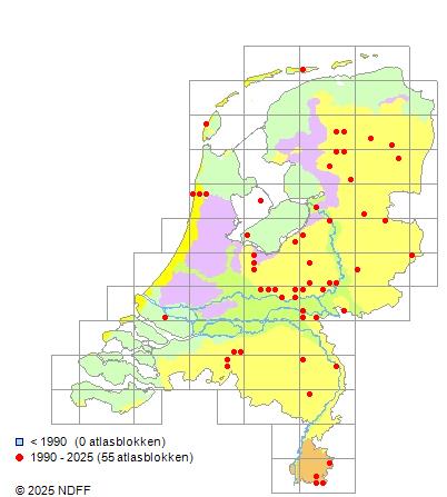 Het aantal atlasblokken (5x5 km) waarin de soort is gemeld binnen een periode van vijf jaar (vanaf 1980) of twintig jaar. Niet gecorrigeerd voor waarnemersinspanning en het aantal doorgegeven waarnemingen kan sterk variëren per periode, dus een trend in verspreiding kan hier niet direct uit worden afgelezen. Het opgegeven jaartal is het eerste jaar van de periode. Bron: gevalideerde waarnemingen uit de NDFF.