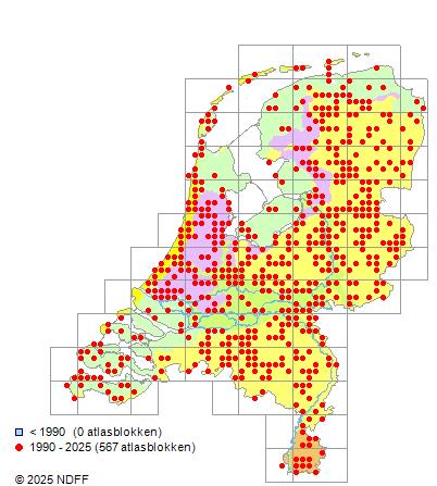 Het aantal atlasblokken (5x5 km) waarin de soort is gemeld binnen een periode van vijf jaar (vanaf 1980) of twintig jaar. Niet gecorrigeerd voor waarnemersinspanning en het aantal doorgegeven waarnemingen kan sterk variëren per periode, dus een trend in verspreiding kan hier niet direct uit worden afgelezen. Het opgegeven jaartal is het eerste jaar van de periode. Bron: gevalideerde waarnemingen uit de NDFF.