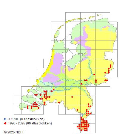 Het aantal atlasblokken (5x5 km) waarin de soort is gemeld binnen een periode van vijf jaar (vanaf 1980) of twintig jaar. Niet gecorrigeerd voor waarnemersinspanning en het aantal doorgegeven waarnemingen kan sterk variëren per periode, dus een trend in verspreiding kan hier niet direct uit worden afgelezen. Het opgegeven jaartal is het eerste jaar van de periode. Bron: gevalideerde waarnemingen uit de NDFF.