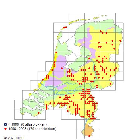 Het aantal atlasblokken (5x5 km) waarin de soort is gemeld binnen een periode van vijf jaar (vanaf 1980) of twintig jaar. Niet gecorrigeerd voor waarnemersinspanning en het aantal doorgegeven waarnemingen kan sterk variëren per periode, dus een trend in verspreiding kan hier niet direct uit worden afgelezen. Het opgegeven jaartal is het eerste jaar van de periode. Bron: gevalideerde waarnemingen uit de NDFF.